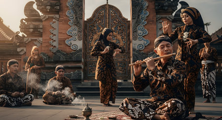 A group of Balinese people dressed in traditional batik and headdresses are gathered for a cultural ceremony in front of an ornate temple gate. An older man plays a suling (bamboo flute) while women perform a traditional dance and incense smoke wafts through the air. The scene is a rich display of Balinese and Indonesian cultural heritage, spirituality, and art.