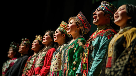 A cultural performance showcasing a choir in traditional costumes, singing songs that reflect their heritage, creating a vibrant celebration of music and cultural identity.