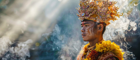Male figure adorned in elaborate traditional attire, featuring rich textures and bright colors, captures the essence of cultural celebration and community spirit, AI generated