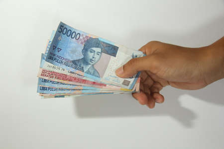 Hand holding Indonesian money paper on white background.business concept