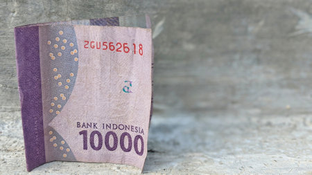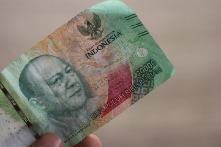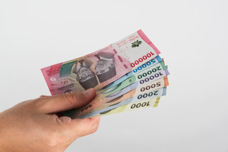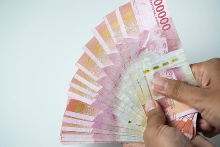 Close-up of hands holding Indonesian Rupiah banknotes. Focus on the hands and the 10000 IDR currency, showcasing financial transactions and wealth. Suitable for illustrating concepts related to economy, investment, and the Indonesian financial market.