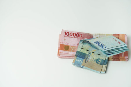 pile of indonesian money (Rupiah) on white background. one hundred thousand and fifty thousand
