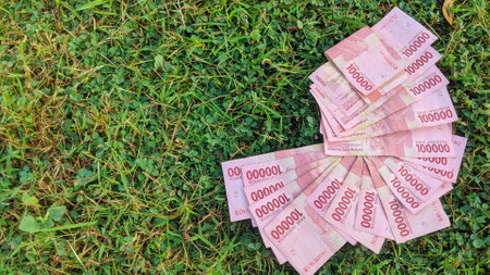 A large pile of 100,000 Indonesian Rupiah banknotes scattered on green grass. The banknotes are a vibrant pink with black and green accents. The scene evokes a sense of abundance and prosperity.