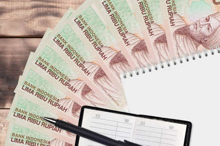 5000 Indonesian rupiah bills fan and notepad with contact book and black pen. Concept of financial planning and business strategy. Accounting and investment