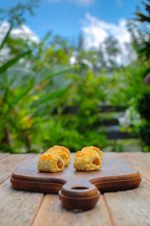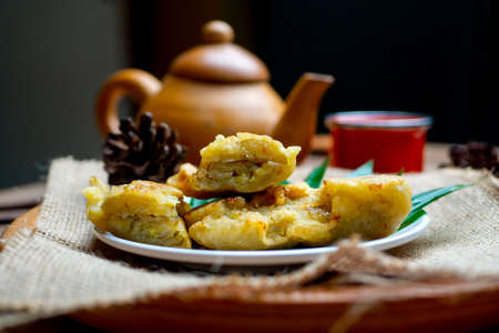 Cireng with chicken filling in a wooden bowl. Cireng is a traditional West Javanese food made from tapioca flour