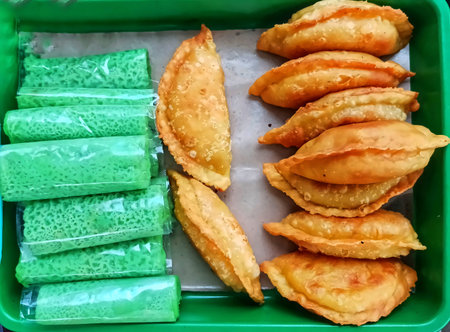 Assortment of traditional Indonesian snacks: green dadar gulung pandan crepes with coconut and savory fried pastel cakes. Authentic street food for iftar or tea time