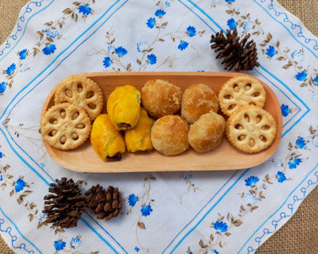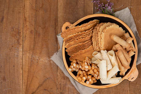 Malaysian traditional cookies called as KUIH SEMPERIT on wooden plate served during Eid Fitri