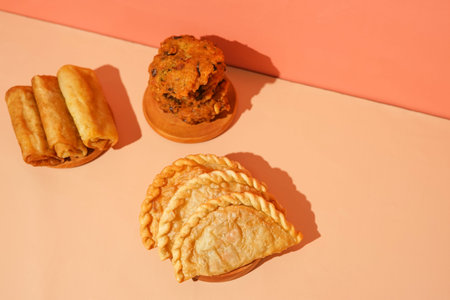 Indian Chicken Pakora with Samosas / Samsa, Pakora and Alo Tikki. Traditional Food.