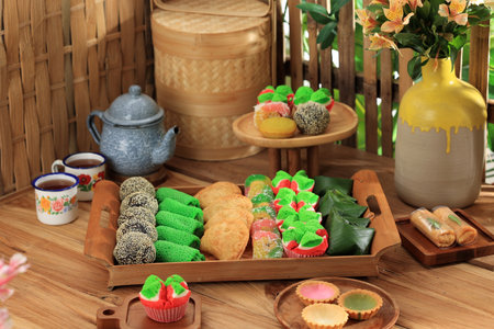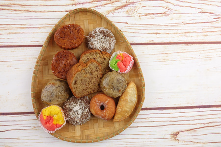 Jajan Pasar Kue tampah, Indonesian Various Street Food, Top View with Copy Space for Text