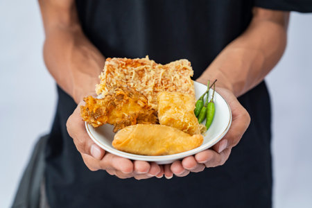 A human hand holding a plate with a gorengan with a white background. Traditional Indonesia food