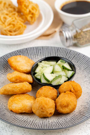 mpek-mpek or pempek. fried fish and tapioca , cucumber slices, yellow noodles served with sweet and sour sauce called vinegar sauce or vinegar sauce. served on glass plates isolated wood background