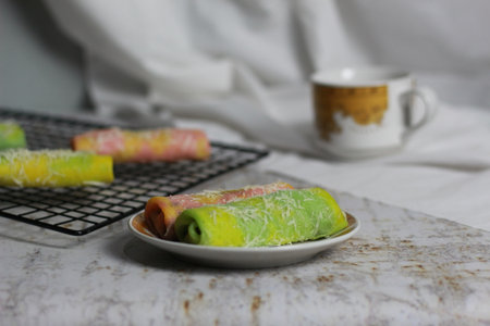 a close up of pancake rolls or Dadar Gulung with a rainbow pattern ready to be served. Food concept photo. Indonesian traditional food.