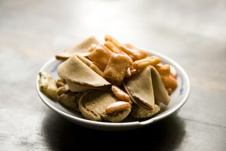 Bowl of Snacks with Fortune Cookies on a Table