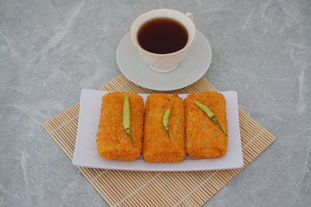 Chicken risoles and hot tea on bamboo mat background.