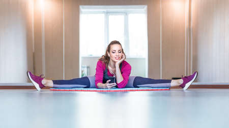 Smiley young woman in sportswear with earphones listening to music and stretching muscles.