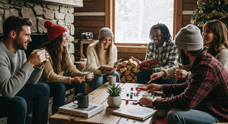 A group of friends enjoying a cozy winter gathering by a fireplace, reading books and playing games, with a Christmas tree in the background