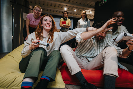 Group of colleagues enjoying an engaging video gaming session in a modern social setting