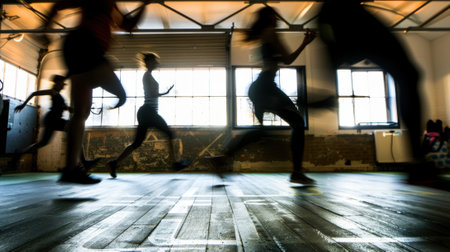 Blurry outlines of participants engage in an indoor bootcamp challenge