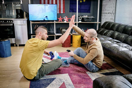 Two young men giving each other high five after playing video game