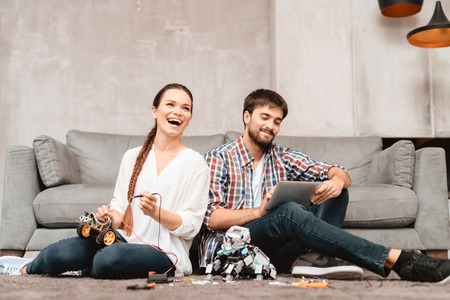 A young couple is sitting on the floor in the living room. They collect robots.