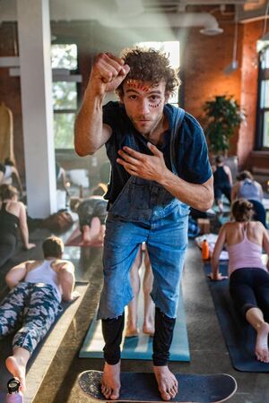 Diverse group of people in yoga class. A portrait of a motivational yogic guide with one hand on his chest and the other creating a fist in the air as participants practice sun salutations.