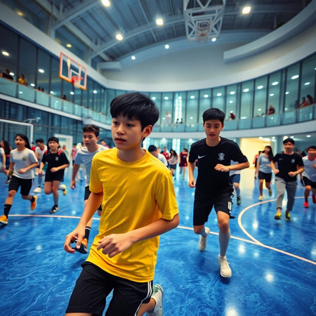 Unidentified Thai students are playing mini-volleyball in the indoor gym.