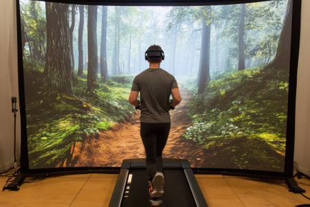 Person exercises on a treadmill in front of a large screen displaying a serene forest landscape.