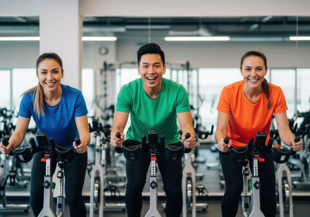 Three cheerful young adults, two women and one man, are happily riding stationary bikes in a bright gym, focusing on cardio fitness and group exercise. this image promotes health, teamwork, and active lifestyle.