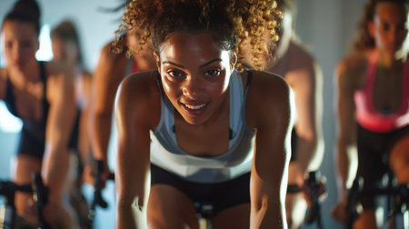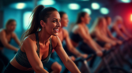 Smiling women enjoying a group workout in a spin class at the gym, radiating health and camaraderie