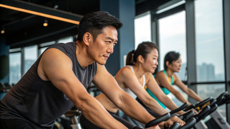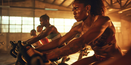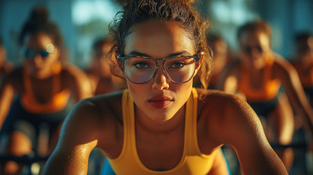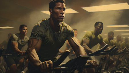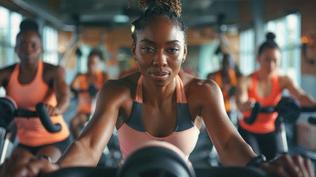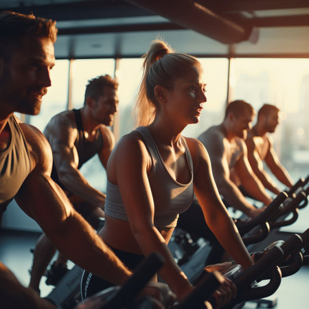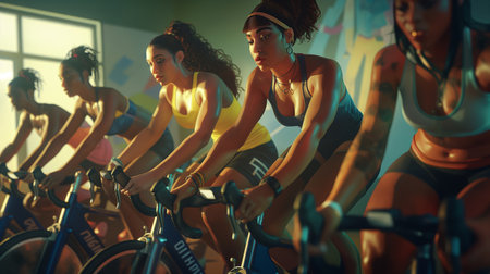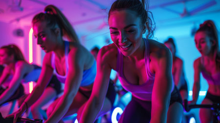 A motivational, group fitness class, featuring participants engaged in an energetic workout, such as spinning, aerobics, set against a vibrant, gym studio background. Generative AI
