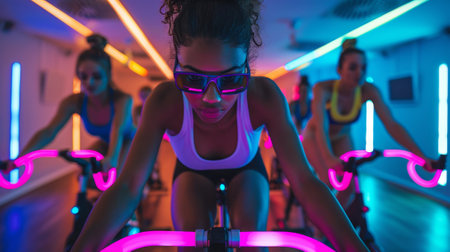 Group cycling class with instructor and colorful neon light streaks in a gym. Clear details and v...