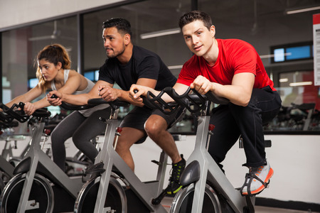 Portrait of a good looking Hispanic young man doing some spinning at a gym and making eye contact