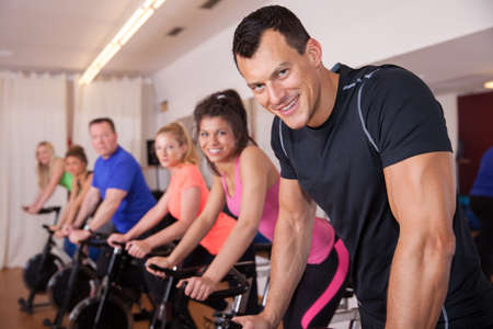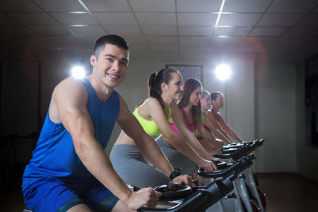 A happy group of people in the gym, smiling and exercising on bikes, enjoying this fun leisure activity