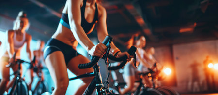 Women participating in a group cycling class on indoor stationary bicycles. Concept Group Fitness, Indoor Cycling, Women's Workout, Exercise Class, Physical Activity