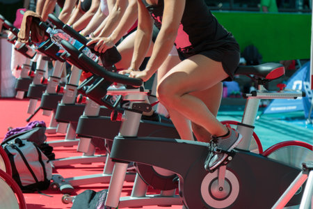 Legs moving during a workout of spinning -----Imperia, IM, Italy - May 18, 2014: People perform a spinning session outdoors in an urban park of liguria. Athlets training an their special bikers to keep healthy
