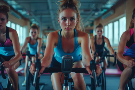 Women cycling in a gym class, focused on indoor exercise and healthy lifestyle