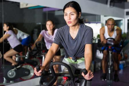 Sportive Latina girl doing spin bike exercises in well-equipped gym