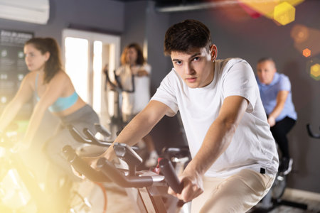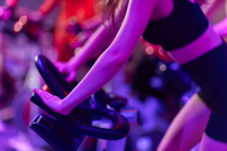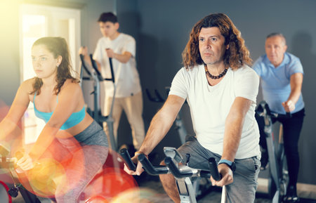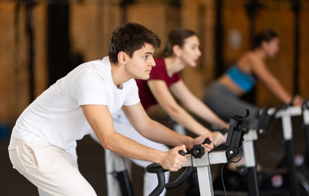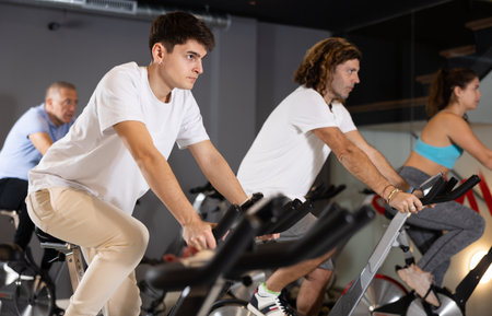People biking in Spinning class at modern gym, exercising on stationary bike. A sporty lifestyle