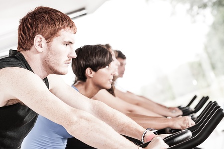 Active Lifestyle - Men & women pedalling on stationery bikes - Shallow DOF Focus on the 1st person/bike