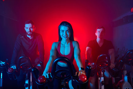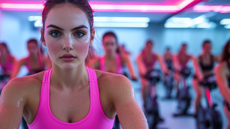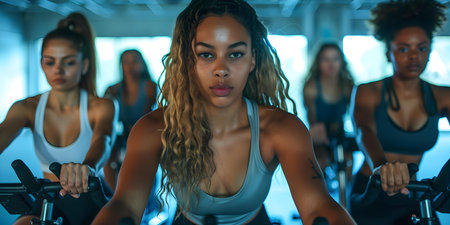 Women concentrating on their workout, engaging in a high-energy indoor cycling class, pushing themselves on stationary bikes in a dynamic fitness studio with atmospheric red lighting