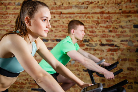 Man and woman taking indoor cycling class at fitness center, doing cardio riding bike