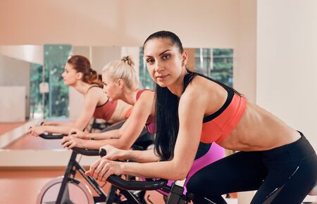 Group of athletic young girls training on spin stationary bike riding in gym. Fit women performs aerobic endurance training workout cardio routine on simulators, cycle training on exercise bike indoor