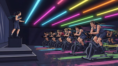Large indoor cycling class with instructor and dynamic neon light effects in a gym.