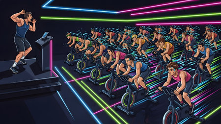 High energy spin class with cyclists pushing limits under vibrant lighting creates a motivating and intense atmosphere