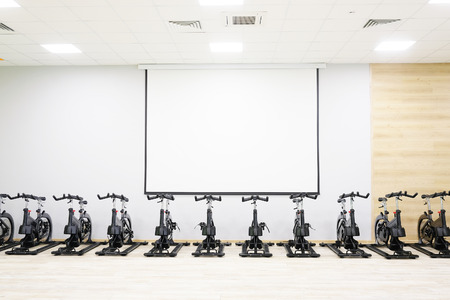 Stationary Spinning bicycles. Indoor cycling for lifestyle design. Fitness background. Healthy lifestyle background. Spinning class with empty bikes. Sport background. Sport, recreation, lifestyle. Fitness workout.