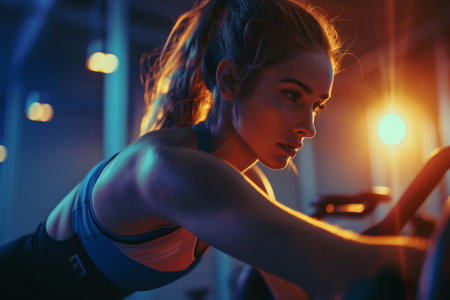 Determined Young Female Athlete Engaging in Intense Indoor Cycling Workout at Fitness Studio with Focus and Motivation AI Generative