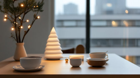 A cozy indoor winter scene featuring a decorative table adorned with a minimalist Christmas tree lamp, warm beverages, and elegant tableware, creating a serene ambiance.