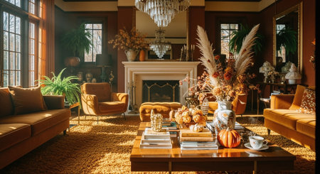 A cozy living room with warm autumn colors, featuring a modern fireplace, plush sofas, and a decorative coffee table adorned with flowers and books