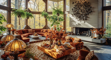 A cozy living room with large windows showcasing autumn foliage, featuring plush orange sofas, decorative lamps, and a centerpiece of pumpkins and fall decor