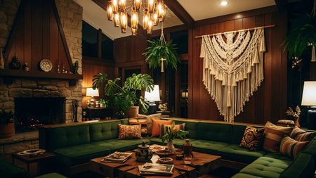 A cozy living room with an orange sectional sofa, stone fireplace, and bookshelves. colorful cushions, plants, and macrame wall hangings create a warm, inviting atmosphere.